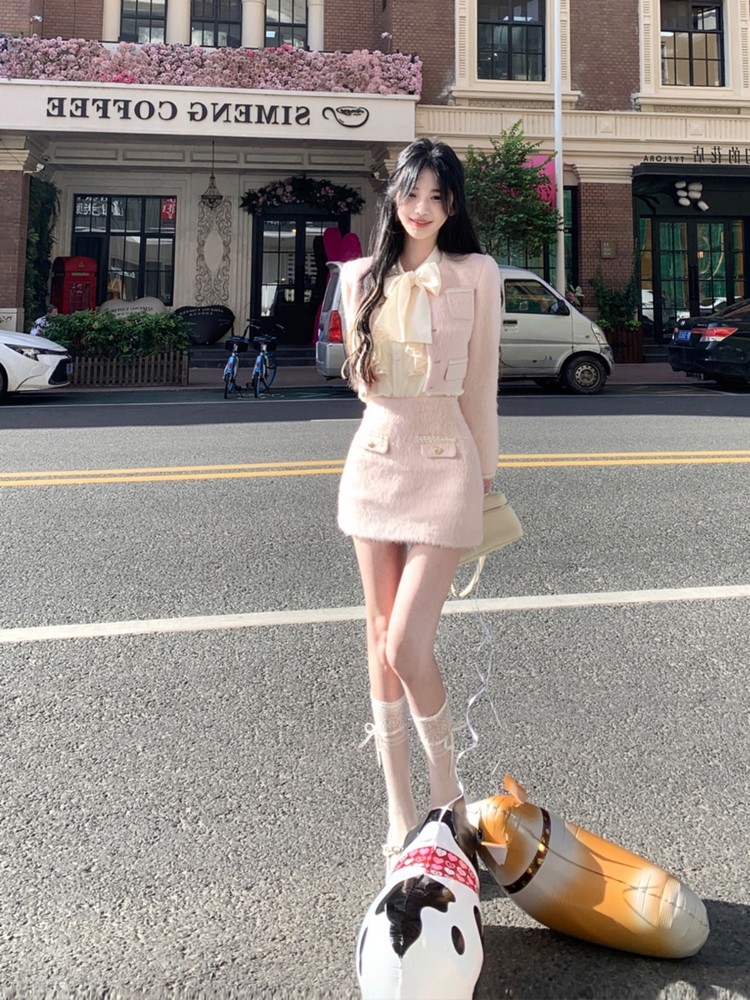 Petite Fit Spring Outfit: Short Jacket with Skirt and Shirt Two-piece Set