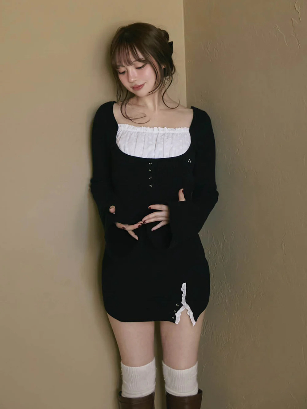 Elevate your early spring wardrobe with our Black Spliced Low Round Neck Long Sleeve Dress. This stunning slim-fit design features a chic short skirt and a daring slit, perfectly blending Y2K style with modern elegance. Crafted for comfort and versatility, it’s ideal for day-to-night transitions. Don’t miss out on this must-have piece add it to your cart today and step out in style!