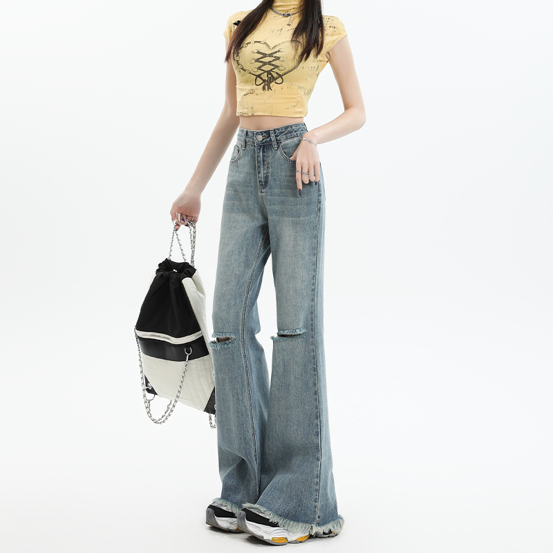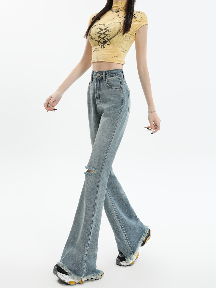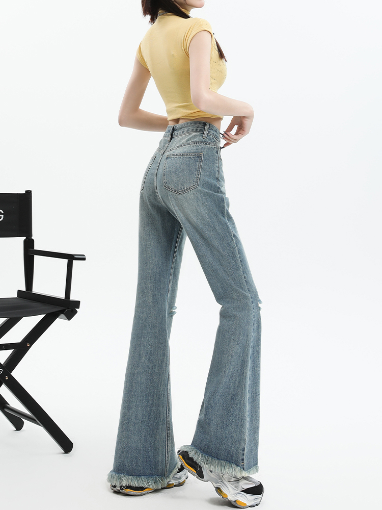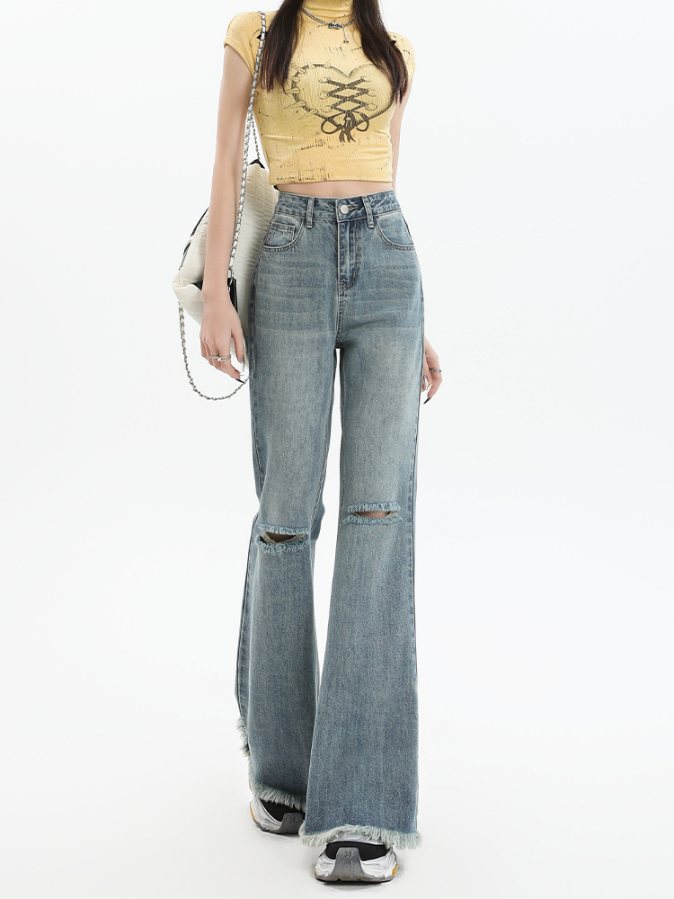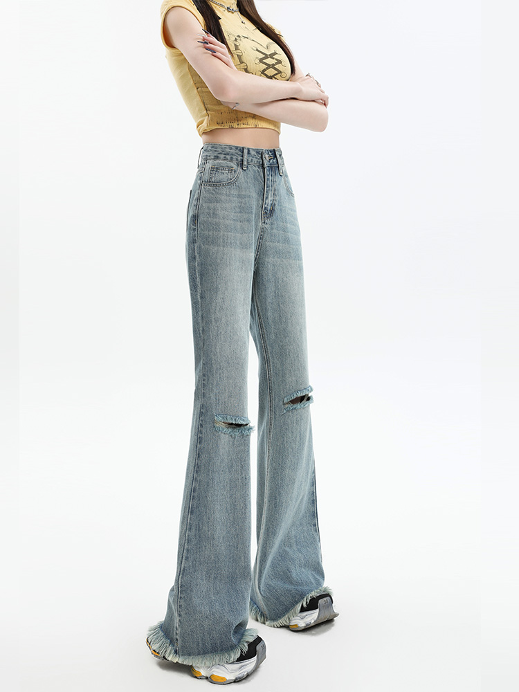 Elevate your spring and summer wardrobe with our High-Waisted Frayed Hole Flared Jeans for Women, designed with an American distressed aesthetic that exudes effortless style. These jeans feature a flattering high-waisted fit that slims your silhouette while the flared legs add a trendy touch, making them perfect for any casual outing. Embrace the season’s fashion with these must-have jeans and make a statement wherever you go. Add to your cart today and step out in style!