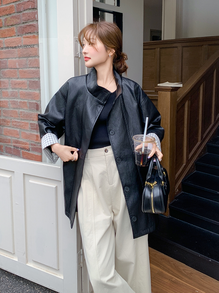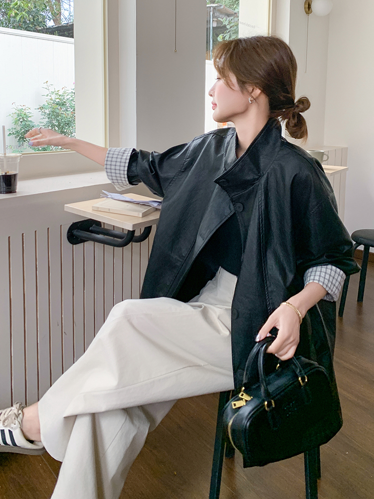 Elevate your wardrobe with our Japanese-Style Retro Black Stand-Collar Leather Jacket for Women. This high-end, mid-length outerwear features a loose slim-fit design that flatters every silhouette while providing exceptional comfort. Crafted from premium leather, it boasts a stylish stand-collar and exquisite detailing that makes it a must-have for spring 2025. Perfect for layering or making a statement on its own, this jacket effortlessly combines fashion and functionality. Don’t miss out on this timeless piece add to your cart today!