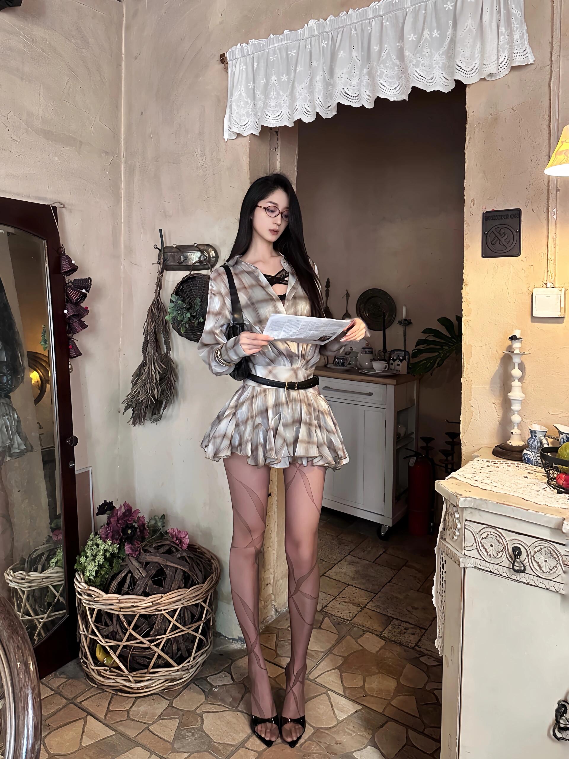 Khaki Plaid Ruffled Short Dress Lapel Collar Loose Fit Pleated Skirt Women, Y2K