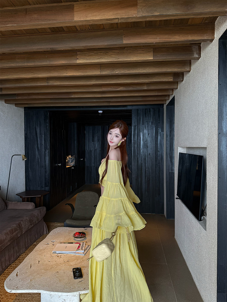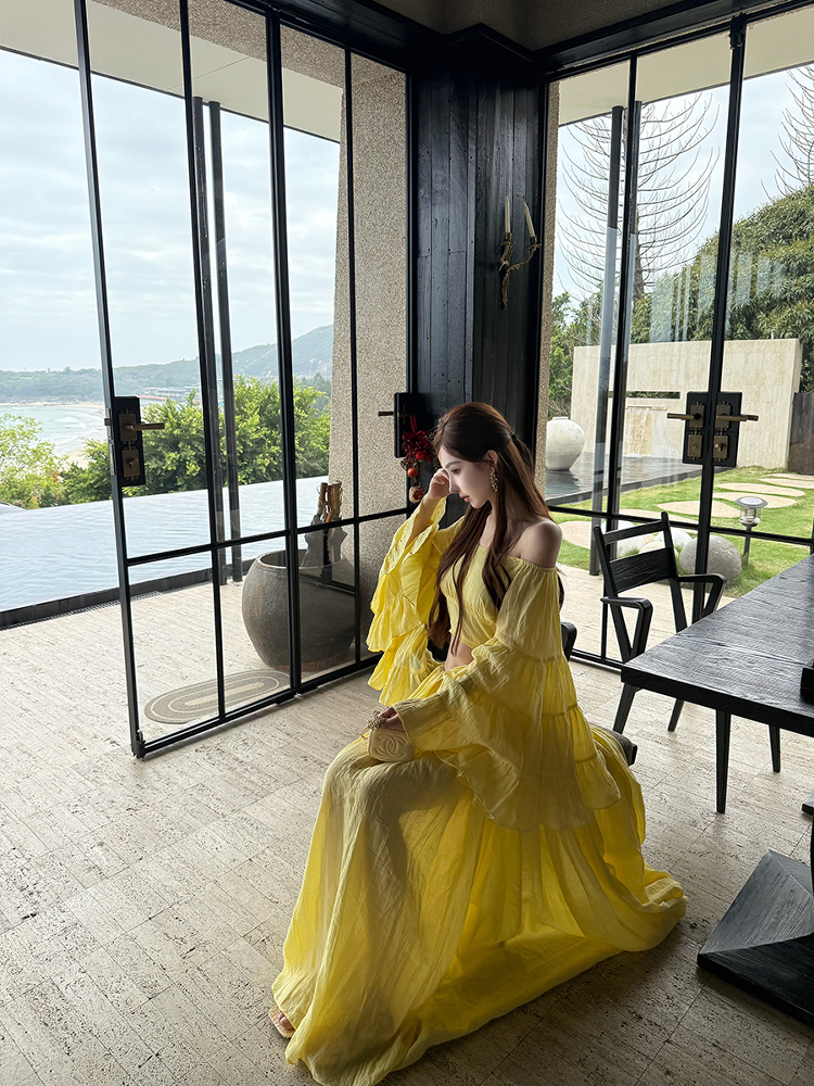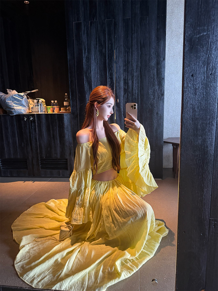 Lemon Lotus Leaf Sleeve Top Flared Skirt Two Mid Length Dress Set Holiday, Y2K Lovers High-quality product featuring holiday dresses, holiday outfits, vacation outfits and more. Modern design that fits the latest trends. Premium materials ensure durability and comfort. Order now for special offers! Product designed with attention to every detail. Suitable for all occasions and personal styles.