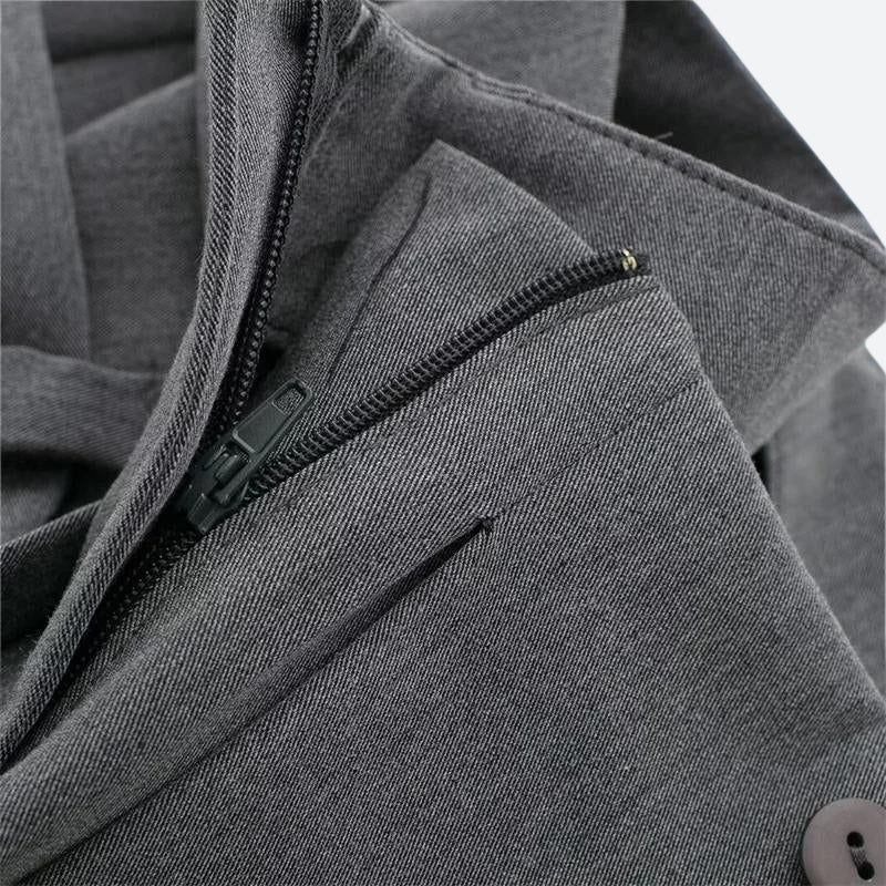 This skort blends the look of a mini skirt with the practicality of shorts. It features a double belted design and an asymmetrical overlay for a modern twist. The neutral grey color makes it versatile for casual or semi-formal outfits. Style it with a fitted blouse or a casual tee for a chic, laid-back ensemble.