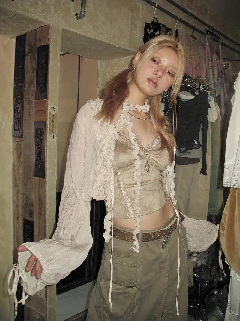 The Fairy Grunge Ruffled Crop Cardigan offers a unique blend of enchantment and edge. Its cropped silhouette, crafted from crinkle material, features a tie fastening at the front and adjustable ties at the cuffs, embodying the fairy grunge aesthetic. Perfect for adding a cool, unique twist to any streetwear look.