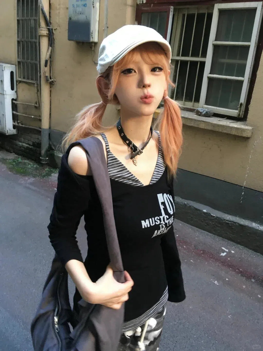 The Grunge Layered Off Shoulder Top brings a rebellious edge to any outfit. With its distressed layered design and bold graphic print, this top blends Y2K and punk aesthetics. The off-shoulder cut and fitted silhouette make it perfect for streetwear styling.