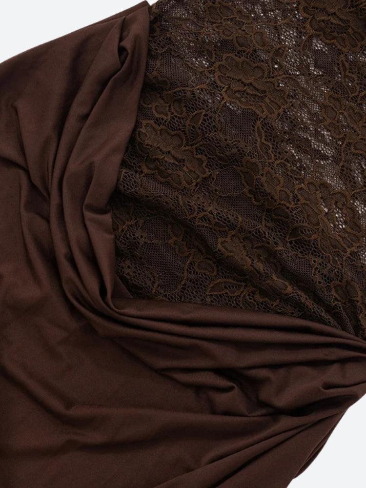 Sultry meets sophistication. The Lace Bodice Maxi Dress stuns with a sheer lace corset top, silky draped skirt, and an off-shoulder neckline that teases just right. It’s elegance with a little edge.