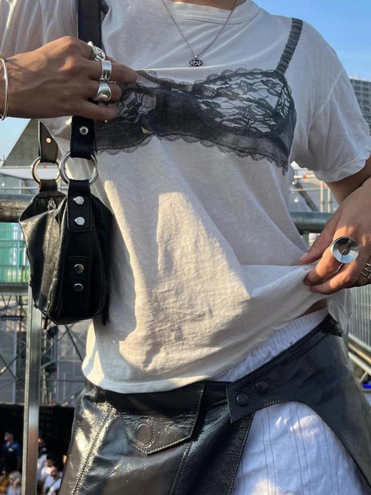 Grab the street-smart charm with this relaxed tee, featuring a peek-a-boo lace bralette design. Its effortless silhouette and unique detail fuse casual comfort with a flirty twist, embodying a casual yet chic aesthetic that stands out in any urban adventure.