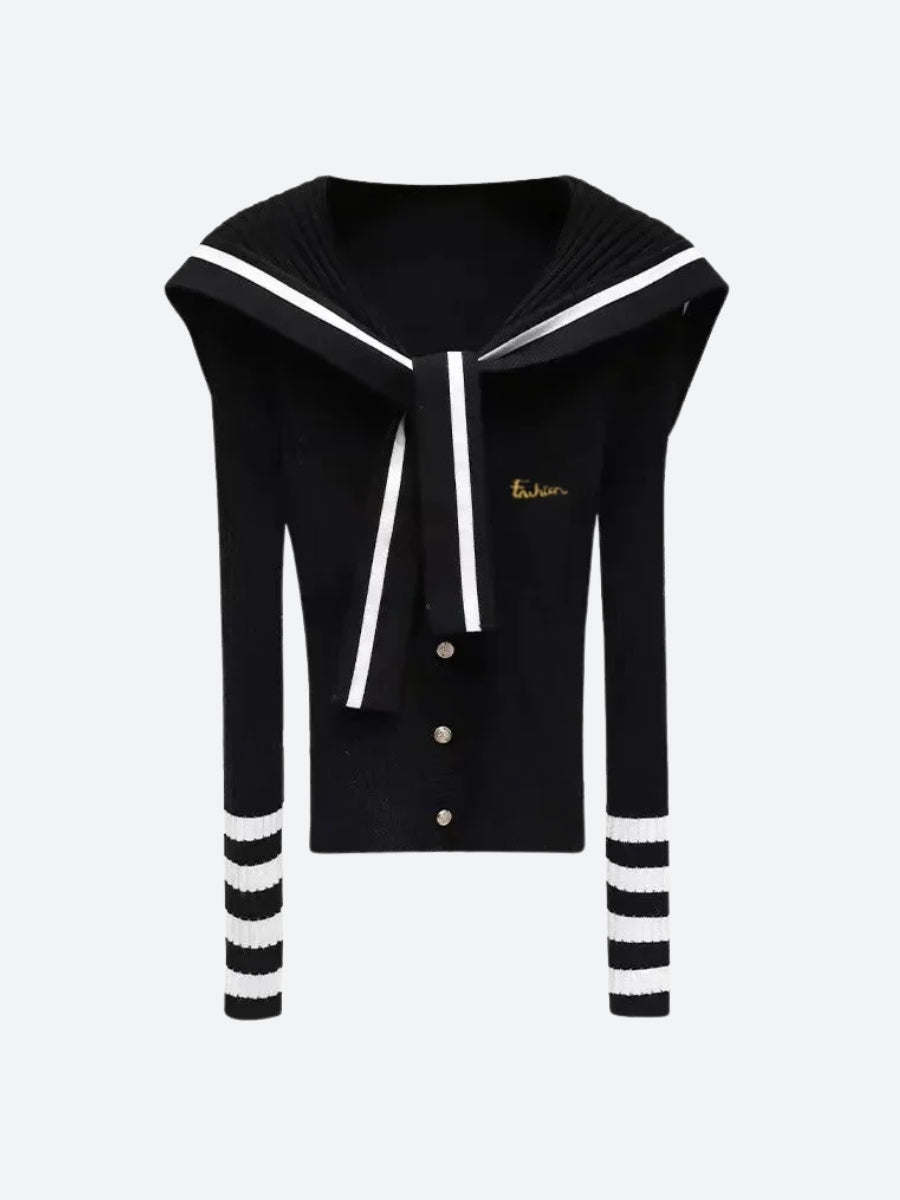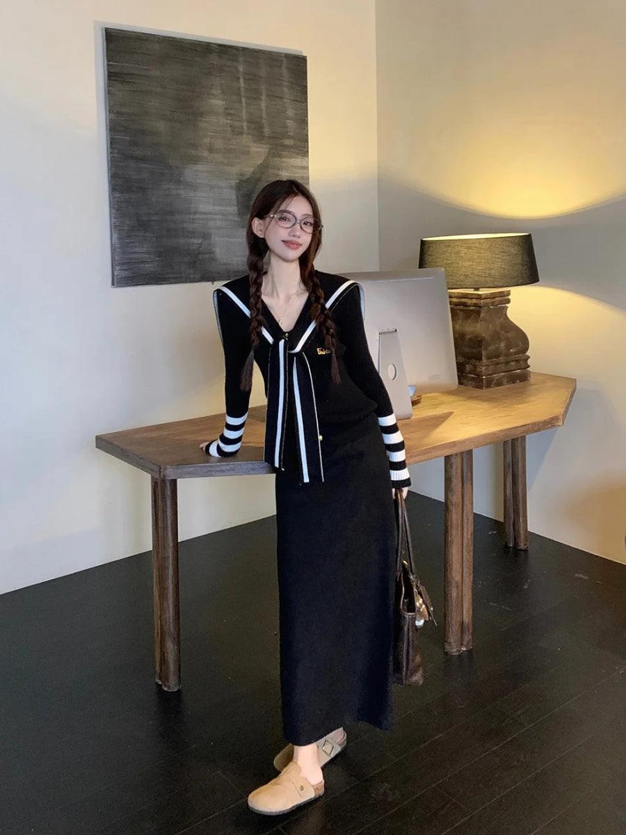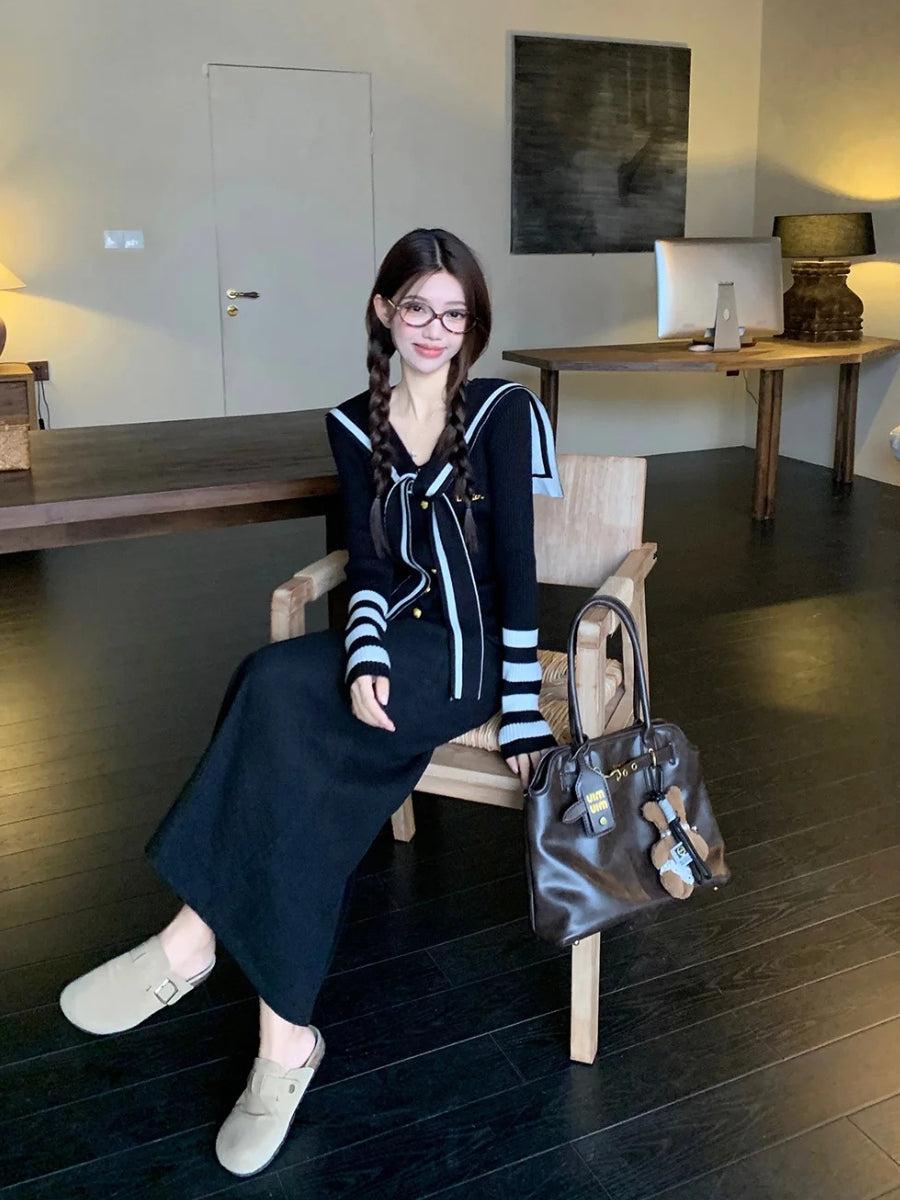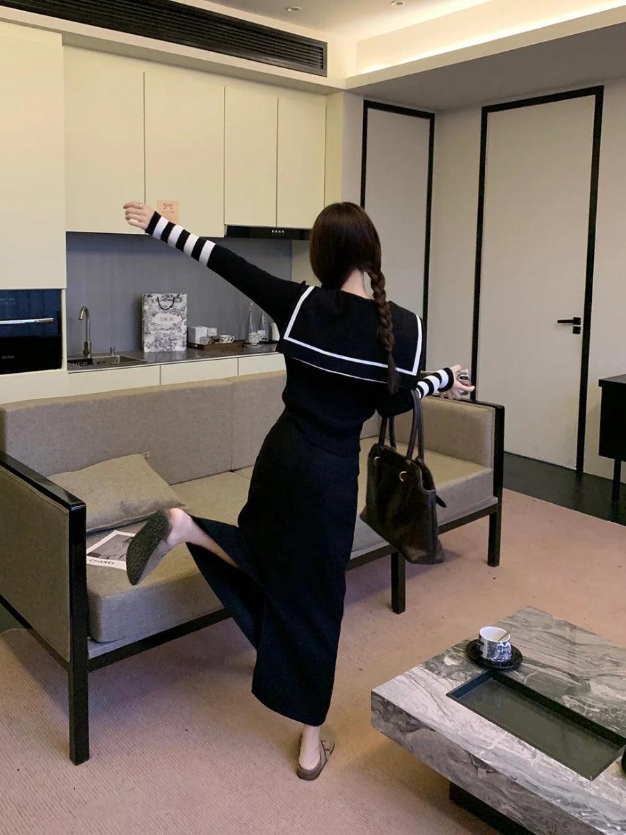 This cozy two-piece set pairs a sailor-inspired knit top with a sleek black maxi skirt. The striped detailing adds a playful contrast while the relaxed fit makes it perfect for chill days or casual outings.