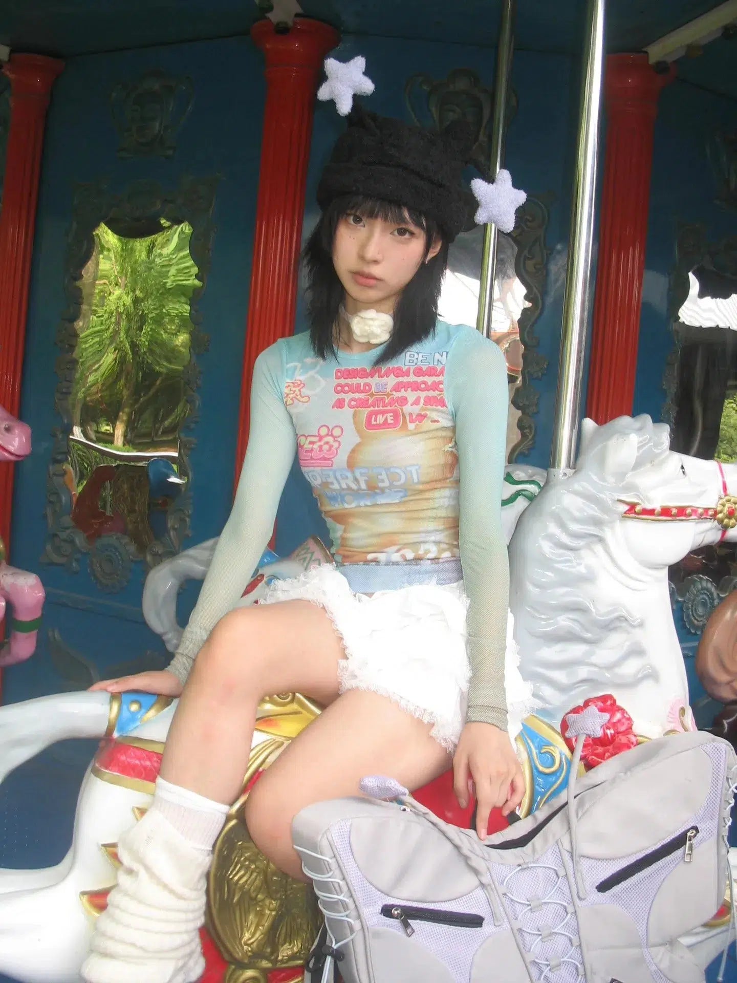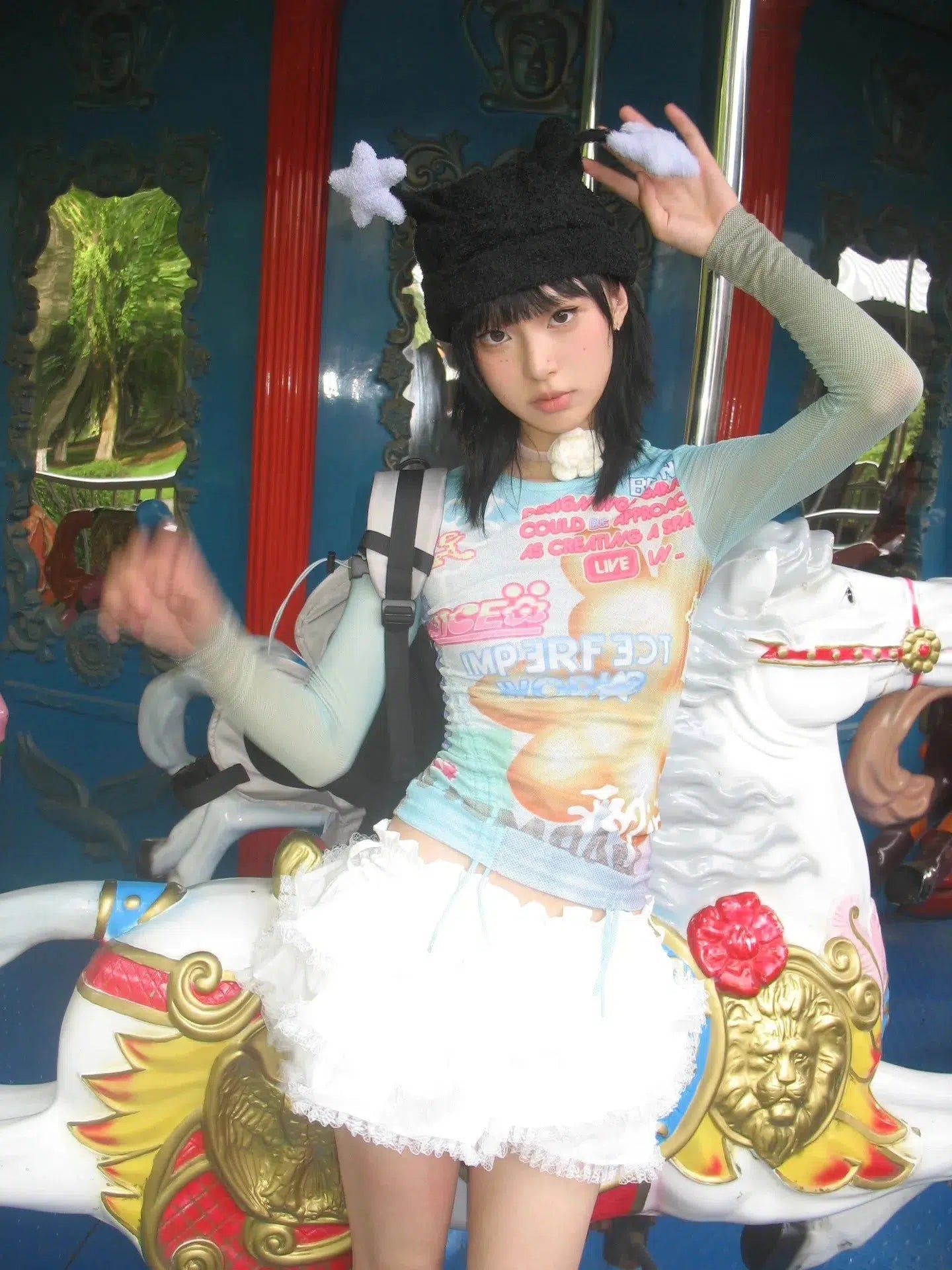 Embrace the whimsical charm of this top. This eye-catching piece features a playful ‘Imperfect World’ graphic in vibrant colors, contrasted beautifully against a delicate and dreamy pastel background. The drawstring detail at the waist adds a touch of customization, allowing you to adjust the fit to your liking.