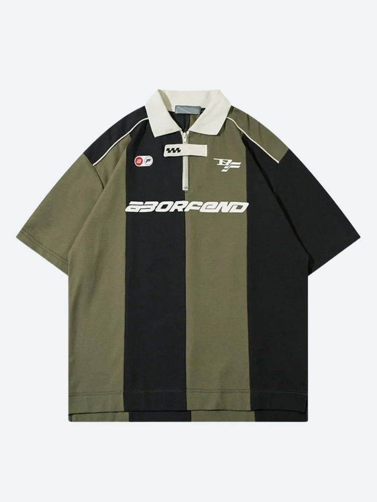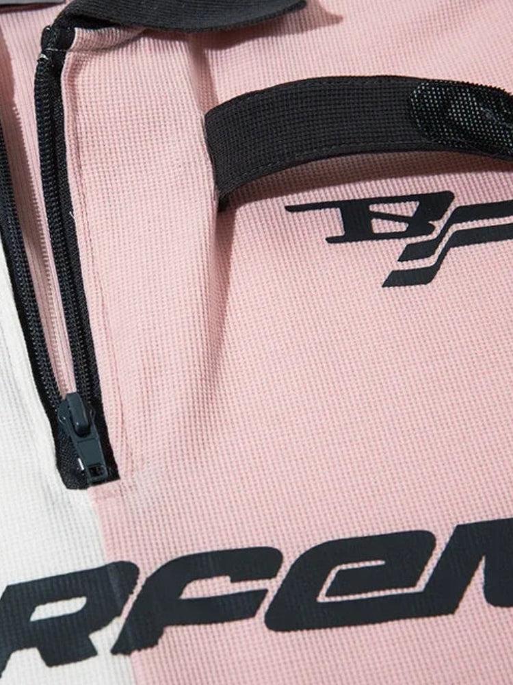 Crafted from a lightweight, breathable fabric, this top offers comfort and versatility. The unique design features a blend of pastel pink and white stripes, complemented by a bold logo on the front. The half zip-up collar adds a modern twist, making it perfect for layering or wearing on its own. Pair it with shorts, jeans, or skirts for a casual yet fashionable look.