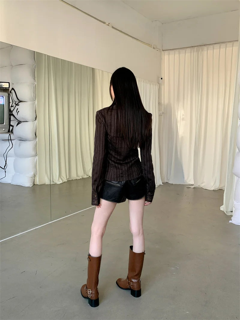 The Striped Neck Tie Shirt is a statement piece for bold fashion lovers. With its sharp pinstripes, tailored silhouette, and matching detachable neck scarf, this shirt is giving edgy sophistication.