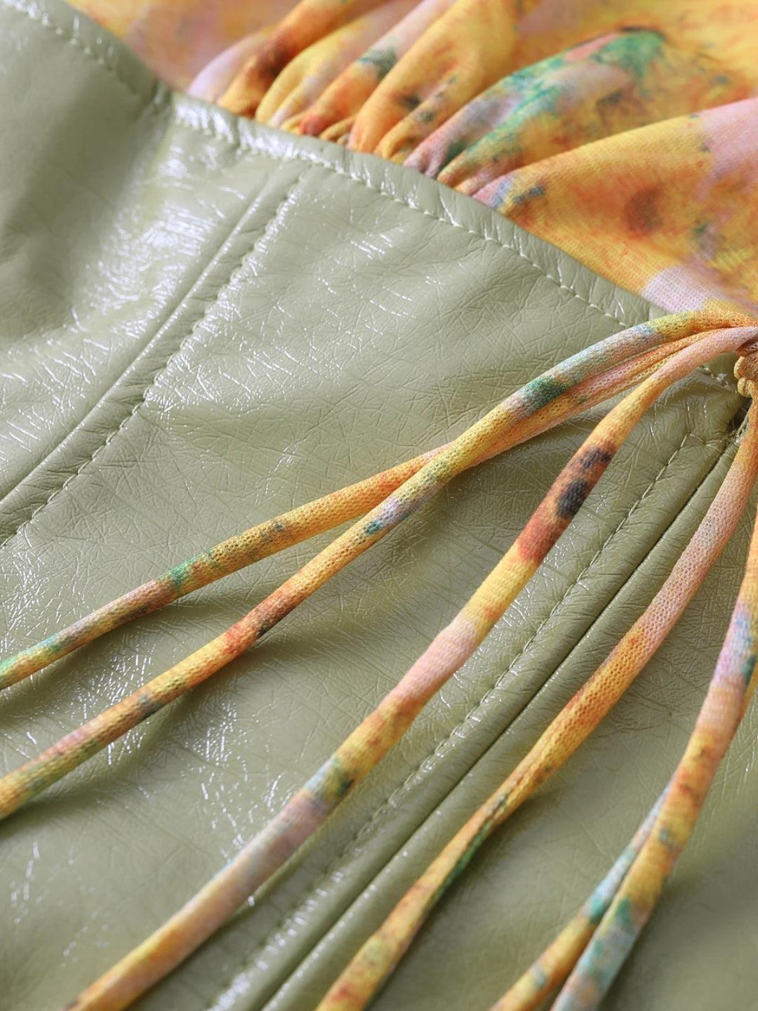 Sheer sunflower halter meets glossy green corset for a dreamy, flirty vibe. This Y2K-inspired date night top turns heads with its bold mix of textures and backless silhouette.