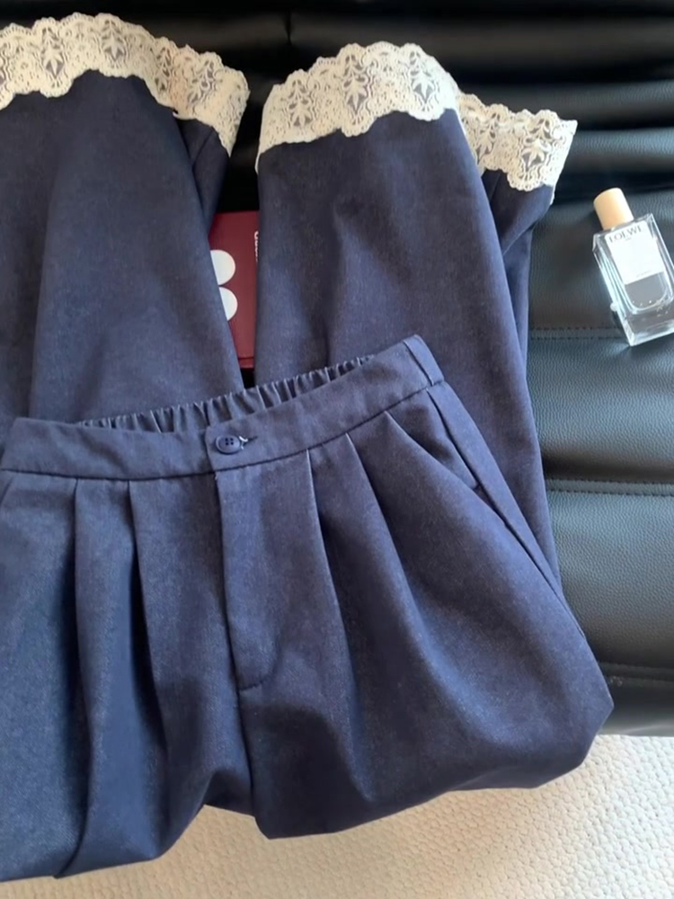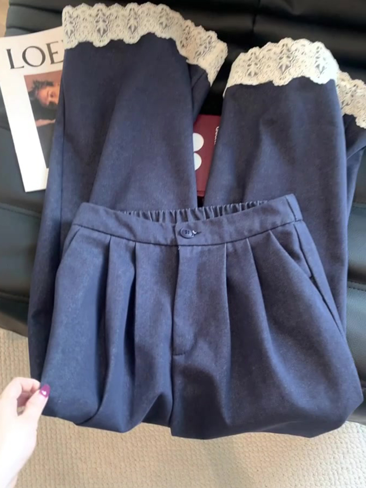 Summer 2025 Women's Deep Blue Lace Spliced Straight-Leg Jeans - Loose and Slimming Wide-Leg Design