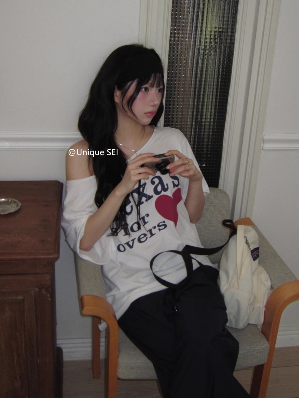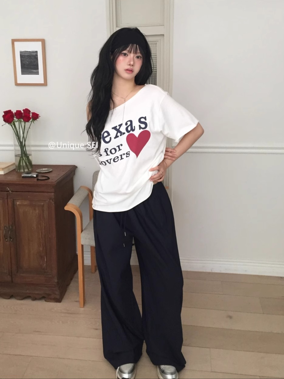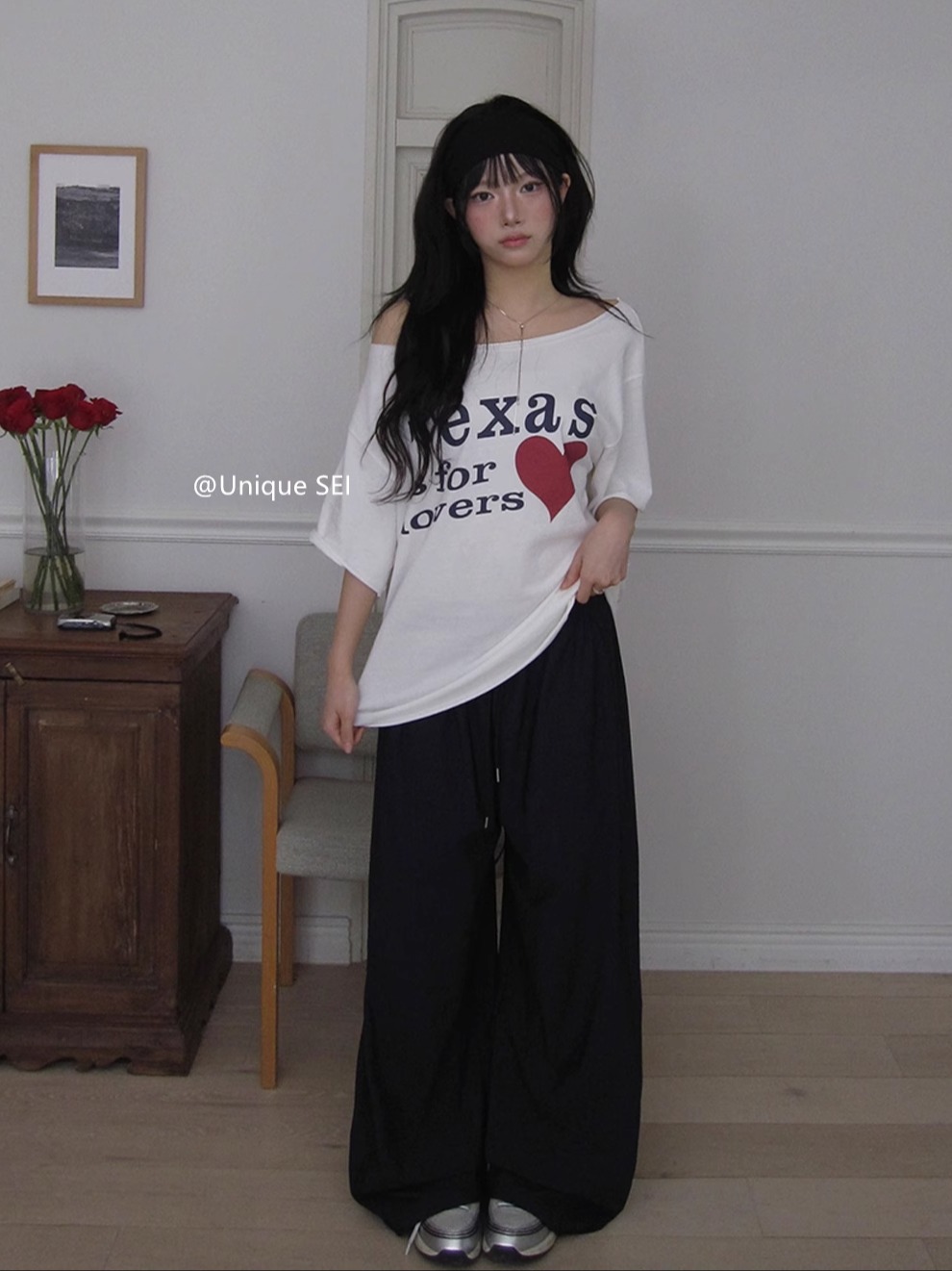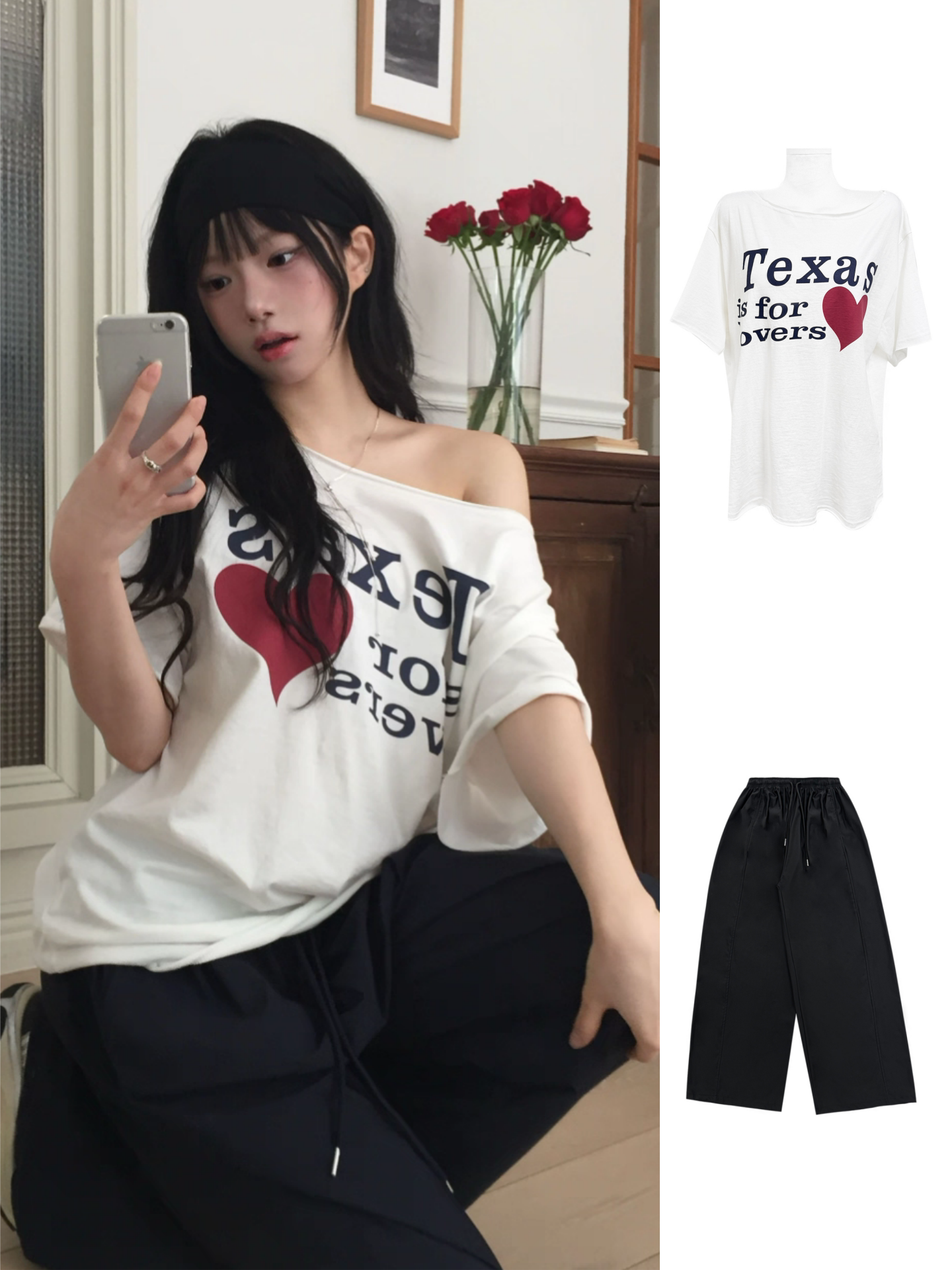 Korean Summer Off Shoulder Heart Letter Loose Short Sleeves, Casual Drawstring Pants High-quality product featuring summer fits, casual outfits, spring outfit and more. Modern design that fits the latest trends. Premium materials ensure durability and comfort. Order now for special offers! Product designed with attention to every detail. Suitable for all occasions and personal styles.