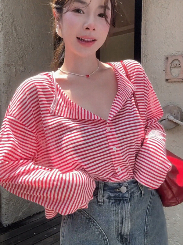 Retro Striped V- Neck Long Sleeve Sun Protection Women Loose C – Summer Fits
