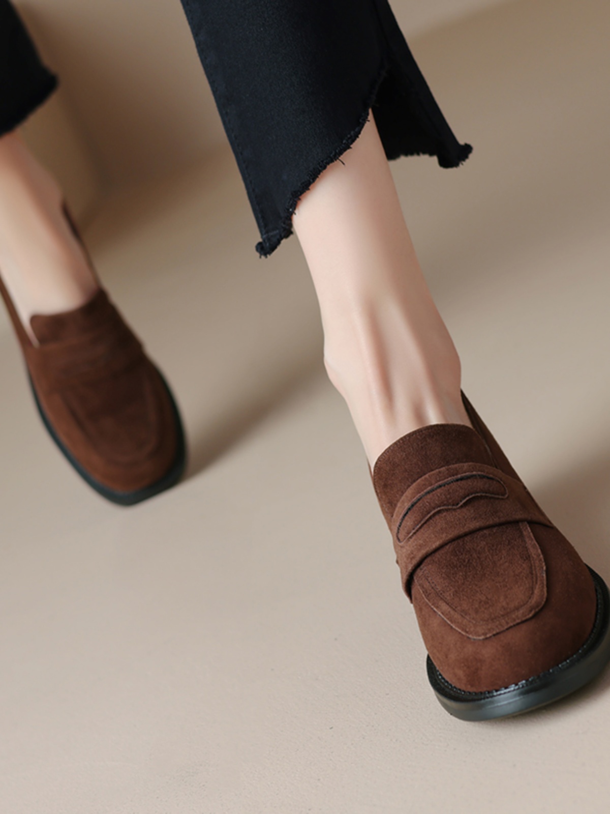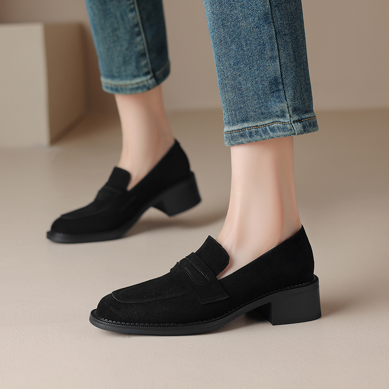 Retro Suede Chunky Heel Loafers Women, Plush Toe Winte – Warm Winter Outfits
